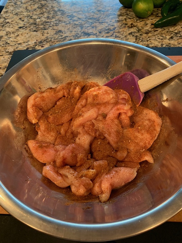 • Slice the chicken breast into 1" thick slices, drizzle with olive oil and add half of the seasoning mix