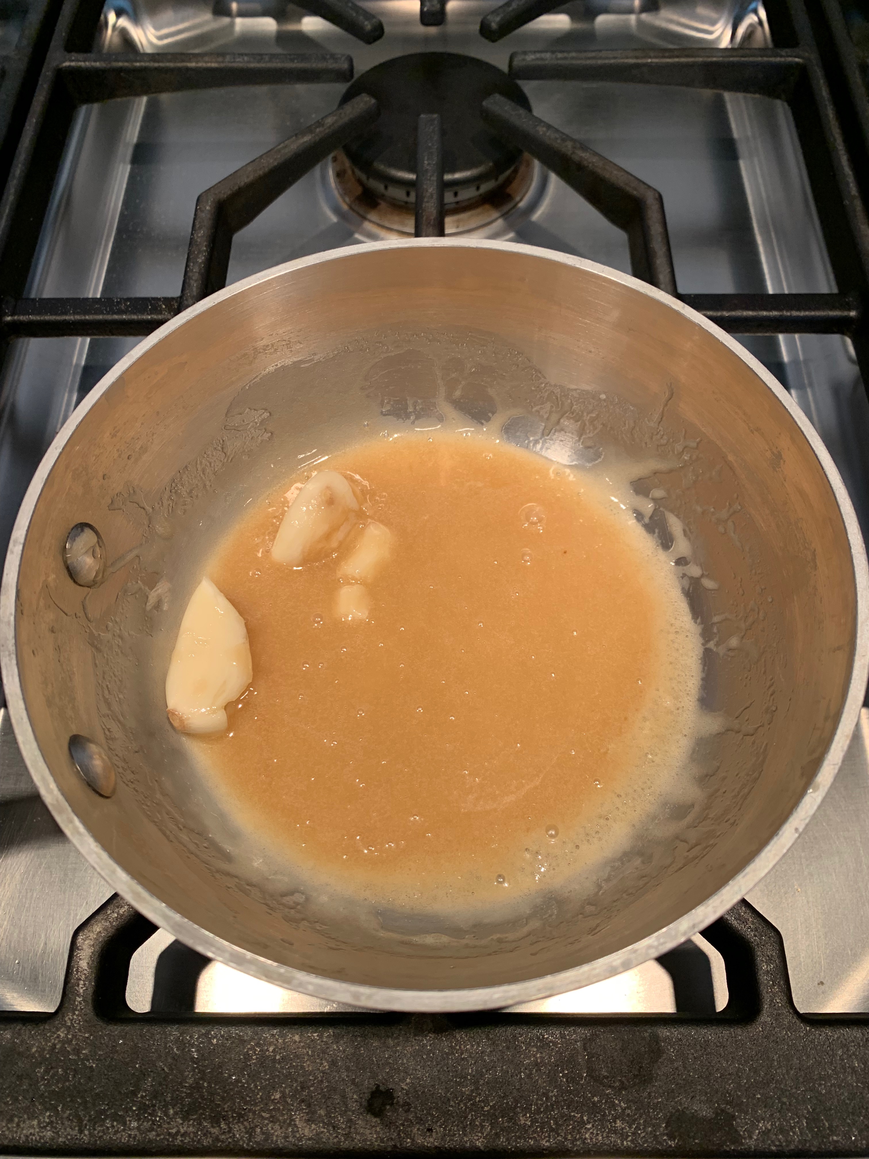 - Heat the honey, butter, brown sugar, garlic cloves and salt in a small sauce pan. Stir to be sure the sugars melt and combine