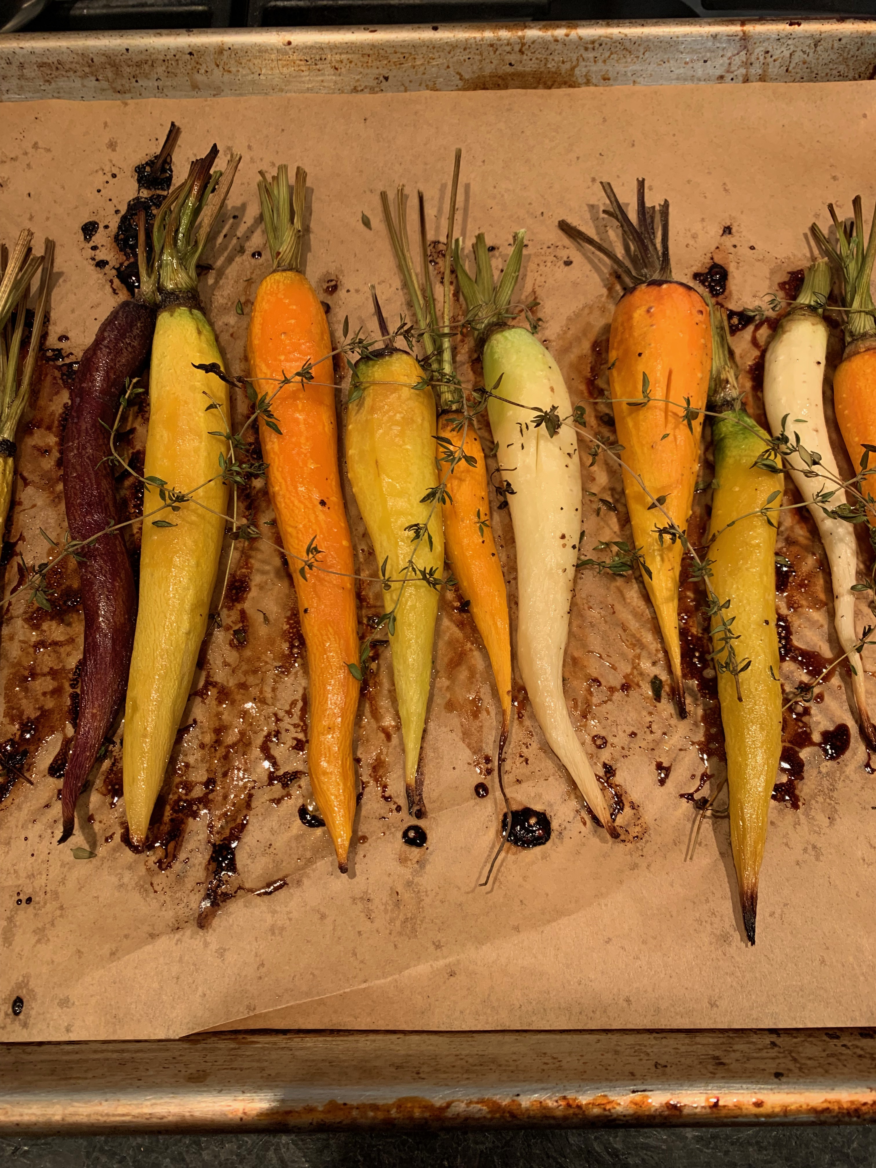 - Remove the garlic cloves and pour or brush the honey-butter mixture onto the carrots, turning to coat all sides, Sprinkle the thyme on top